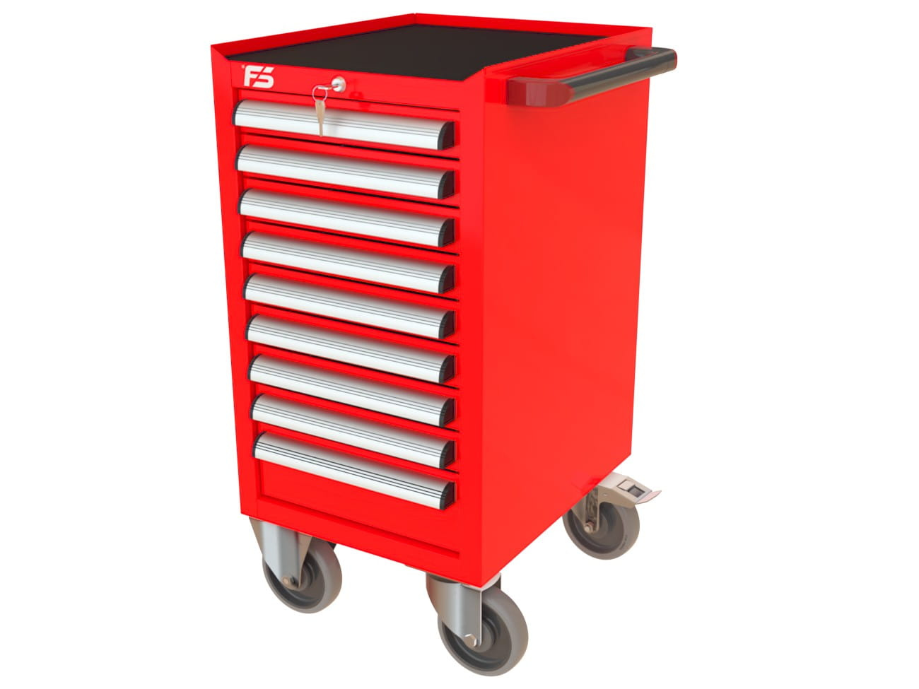 Jeden kluczyk blokuje wszystkie szuflady — ten sam system co w wózku MEGA