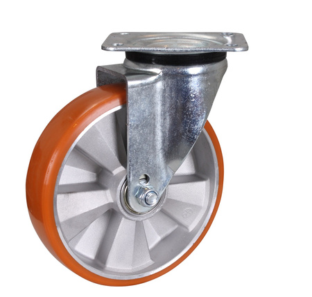 Koło obrotowe, 200 x 50 mm, (poliuretanowe) wulkanizowany bieżnik z poliuretanu na feldze aluminiowej z precyzyjnym łożyskiem kulkowym Twardość Shore: 92° + 5° Shore A Odporne na temperatury od -20°/+80°C Wysokość całkowita koła: 235 mm Rozmiar płytki: 110 x 3 x 135 mm Rozstaw otworów: 75/80 x 105 mm Nośność: 500 kg EAN-Nr.: 4035694042476