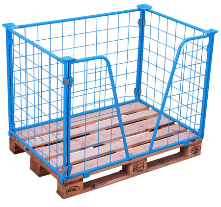 Wymiary wew.: 1.160 x 760 mm (szer./gł.) do palety o wymiarach: 1.200 x 800 mm (szer./gł.) Wysokość użytkowa: 1.000 mm Wykonanie: * stabilna spawana konstrukcja z siatką, wymiar siatki: 100 x 100 x 4 mm * 4 talerze do bezpiecznego sztaplowania * na jednej długiej ścianie wycięcie w kształcie litery V * składana Kolor: RAL 5012 jasnoniebieski malowanie proszkowe Udźwig: 1.000 kg 3 razy sztaplowana, spiętrowanych nadstawek nie należy przemieszczać EAN-Nr.: 4035694002029