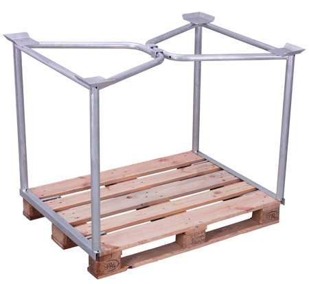 Wymiary wew.: 1.125 x 800 mm (szer./gł.) do palety o wymiarach: 1.200 x 800 mm (szer./gł.) Wysokość użytkowa: 1.600 mm Wykonanie: * stabilna konstrukcja stalowa, na górze 2 stabilizujące pałąki z hakami połączeniowymi * 4 talerze do bezpiecznego sztaplowania * składana Powierzchnia ocynkowana Udźwig: 750 kg 3 razy sztaplowana, spiętrowanych nadstawek nie należy przemieszczać EAN-Nr.: 4035694006805