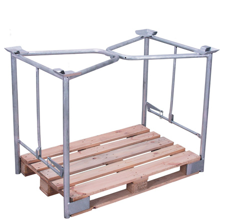 Wymiary wew.: 1.200 x 1.000 mm (szer./gł.) do palety o wymiarach: 1.200 x 1.000 mm (szer./gł.) Wysokość użytkowa: 1.000 mm Wykonanie: * solidna stalowa konstrukcja * do montażu na załadowanej już palecie * blokowanie elementów ramy poprzez zaciski ręczne * 4 talerze do bezpiecznego sztaplowania * składana Powierzchnia ocynkowana Udźwig: 1.500 kg 3 razy sztaplowana, spiętrowanych nadstawek nie należy przemieszczać EAN-Nr.: 4035694012998