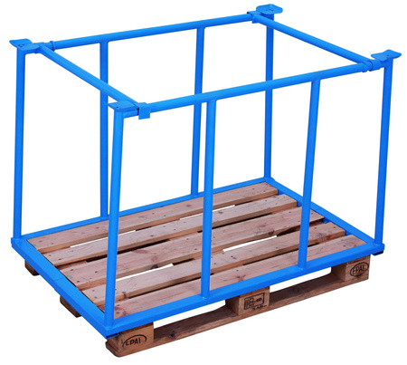 Wymiary wew.: 1.200 x 935 mm (szer./gł.) do palety o wymiarach: 1.200 x 1.000 mm (szer./gł.) Wysokość użytkowa: 1.155 mm Wykonanie: * solidna, stalowa konstrukcja * 4 talerze do bezpiecznego sztaplowania * składana Kolor: RAL 5012 jasnoniebieski malowanie proszkowe Udźwig: 500 kg 3 razy sztaplowana, spiętrowanych nadstawek nie należy przemieszczać EAN-Nr.: 4035694002456