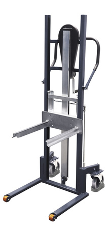 Wymiary zew.: 620 x 730 x 1.545 mm (szer./gł./wys.) Długość wideł: 450 mm Prześwit między widłami: 300 mm Wykonanie: * spawana konstrukcja stalowa * zakres podnoszenia od 55 - 1.300 mm regulowany bezstopniowo przy pomocy ręcznej korbki * korbka z samoblokującym gwintem * środek ciężkości: 230 mm od masztu * drążek hamulca na ergonomicznej wysokości, hamulec działa na koła z pełnej gumy * duży pałąk dla lekkiego i łatwego manewrowania * pałąk z miękką powłoką uchwytu Kolor: RAL 7016 szary antracytowy, malowanie proszkowe Koła: 2 koła obrotowe z gumy termoplastycznej, felga z precyzyjnym łożyskiem kulkowym, szare, bezśladowe, Ø 160 mm oraz z przodu 2 koła stałe z poliuretanu Ø 50 mm, koła obrotowe z osłoną stopy Nośność: 250 kg EAN-Nr.: 4035694076235