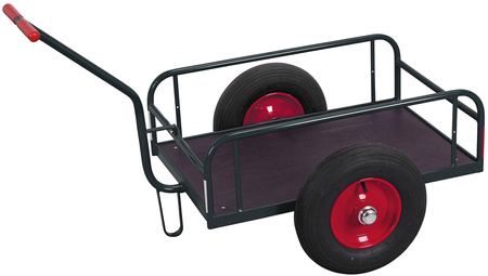 Wymiary zew.: 1.900 x 810 x 860 mm (szer./gł./wys.) Powierzchnia użytkowa: 1.125 x 535 mm (szer./gł.) Wysokość załadunkowa: 225 mm Wysokość ścian czołowych: 145 mm Wysokość długich ścian: 245 mm Wykonanie: * spawana konstrukcja z profili i kątowników stalowych * 2 czerwone nakładki na uchwycie * z ręcznym dyszlem * powierzchnia użytkowa z płyty sklejki film/antypoślizg, wodoodpornej (antypoślizg u góry) Kolor RAL 7016 szary antracytowy, malowanie proszkowe Koła pneumatyczne, na feldze stalowej z precyzyjnym łożyskiem kulkowym, czarne, Ø 400 x 100 mm Nośność: 400 kg EAN-Nr.: 4035694076792