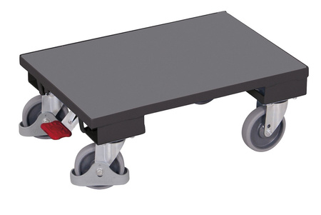 Wymiary zew.: 610 x 415 x 235 mm (szer./gł./wys.) Powierzchnia użytkowa: 610 x 415 mm (szer./gł.) Wysokość załadunkowa: 235 mm Wykonanie: * bez narożnych tulejek * przystosowany do skrzynek typu Euro 600 x 400 mm (szer./gł.) * powierzchnia użytkowa bez krawędzi * powierzchnia użytkowa z płyty MDF, okleina ciemnoszara Kolor: RAL 7016 szary antracytowy, malowanie proszkowe Koła: Koła z gumy szarej termoplastycznej, felga z tworzywa, precyzyjne łożysko kulkowe, bezśladowe, Ø 125 mm, 4 koła obrotowe w tym 2 z centralnym hamulcem EasySTOP i osłoną stopy Nośność: 250 kg EAN-Nr.: 4035694078796