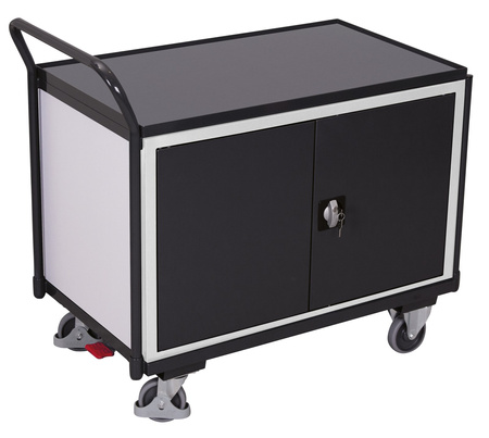 - 1 szafa stalowa na całej szerokości wózka z zamykanymi drzwiami dwuskrzydłowymi, wymiary wew.: 890 x 575 x 575 mm (szer./gł./wys.), z 1 stałą i 1 regulowaną półką, z zamkiem obrotowym
