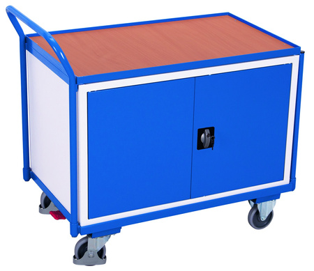 - 1 szafa stalowa na całej szerokości wózka z zamykanymi drzwiami dwuskrzydłowymi, wymiary wew.: 890 x 575 x 575 mm (szer./gł./wys.), z 1 stałą i 1 regulowaną półką, z zamkiem obrotowym