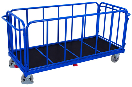 Wymiary zew.: 2.275 x 900 x 1.105 mm (szer./gł./wys.) Powierzchnia użytkowa: 2.005 x 810 mm (szer./gł.) Wysokość załadunkowa: 305 mm Wykonanie: * stabilna, stalowa konstrukcja * z 2 czołowymi i 2 długimi burtami, wtykanymi, wysokość użytkowa: 800 mm * powierzchnia użytkowa z antypoślizgowej sklejki Kolor: RAL 5010 niebieski malowanie proszkowe Koła: Koła z elastycznej gumy pełnej na feldze aluminiowej z precyzyjnym łożyskiem kulkowym, czarne, Ø 200 mm, 2 stałe i 2 z hamulcem. Koła z hamulcem z osłoną stopy Nośność: 1.200 kg EAN-Nr.: 4035694004757